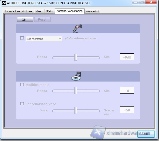 Il pannello delle Tunguska è dotato inoltre di una tab ”Karaoke/Voce Magica” che ci consentirà di dare un effetto alla voce o alla riproduzione di brani.