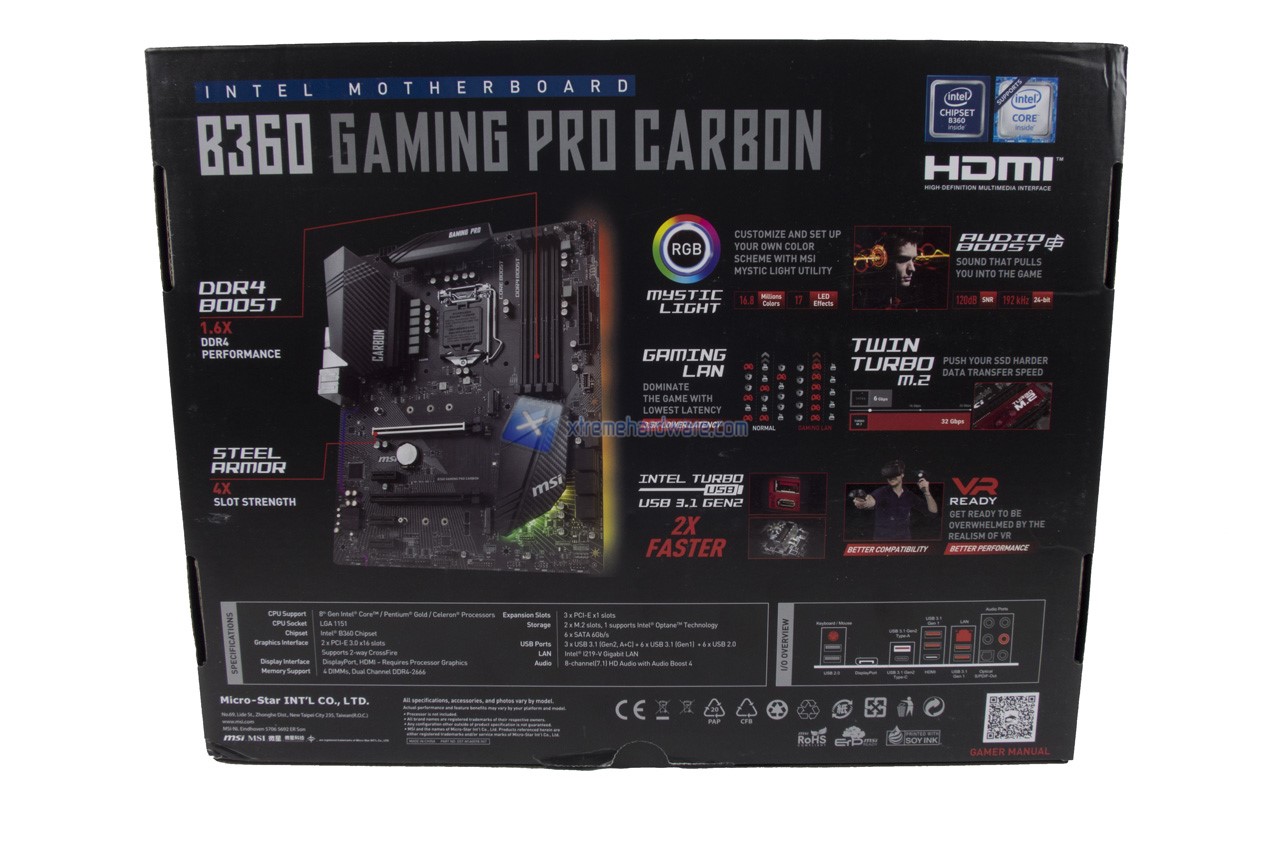 La MSI B360 Gaming Pro Carbon giunge nella classica confezione di cartone di forma rettangolare. La grafica e colorazione è sempre tendente al nero anche per mantenere una migliore affinità al ‘’Carbon’’ inerente il modello e serie. Vengono riportate tutte le principali caratteristiche, specifiche e informazioni circa il modello.