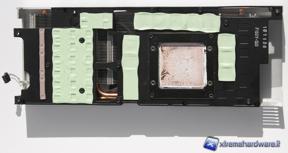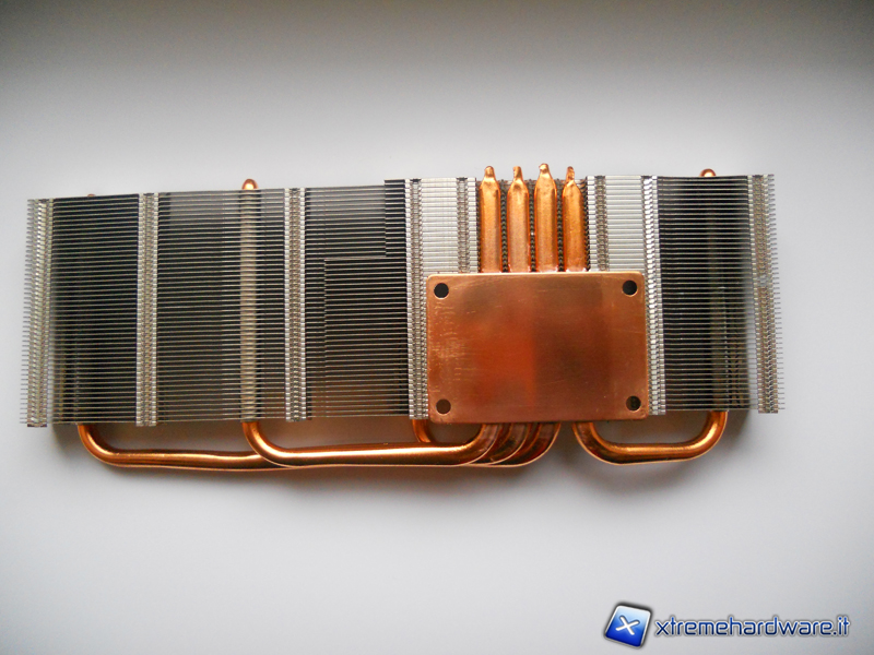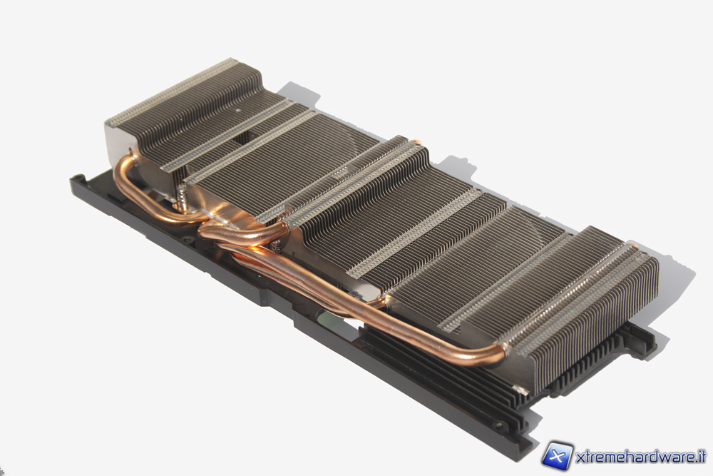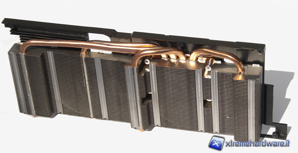 La seconda e la terza parte che compongono il dissipatore sono unite tra di loro e sono il dissipatore della GPU e quello adibito alle memorie e alla circuiteria d'alimentazione. Il dissipatore della GPU presenta 4 grosse heatpipes che si diramano dalla base fino all'imponente radiatore, sia la base che le heatpipes sono completamente in rame. Il dissipatore dei chip di memorie e della circuiteria d'alimentazione si discosta dal resto per la sua colorazione nera e per l'utilizzo di pad termici invece della pasta termica, questa scelta ovviamente è dovuta all'irregolarità della superficie da dissipare.