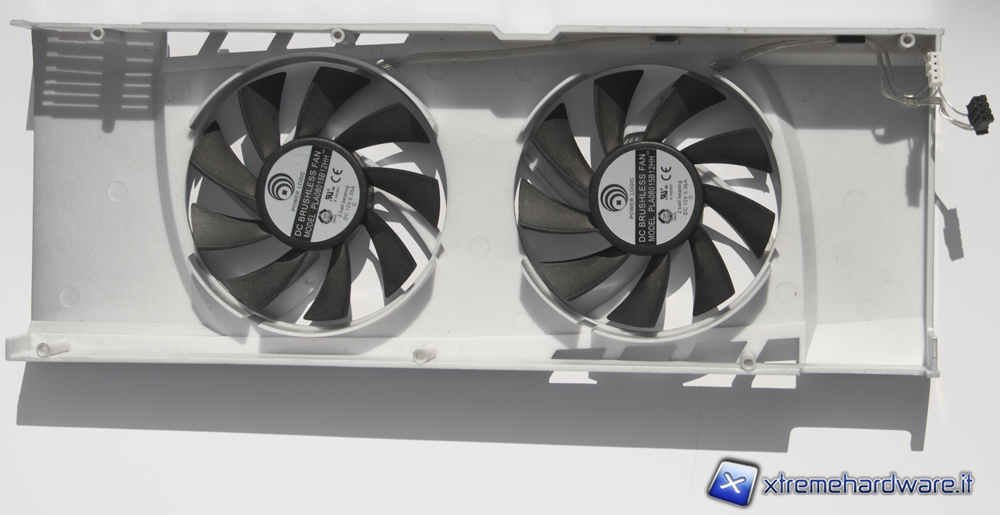 Partendo dall'esterno, troviamo la cover con le due ventole da 80mm. La cover non presenta prese d'aria degne di nota e inoltre è realizzata completamente in plastica, una scelta discutibile per una scheda video enthusiast. Le ventole utilizzate sono a doppio cuscinetto, tuttavia durante i test risulteranno un pochino rumorose.