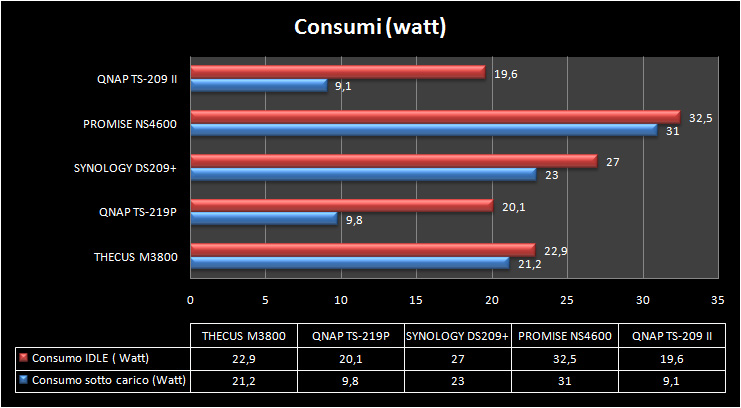 Il consumo di energia è stato eccellente, sostanzialmente corrispondenti al TS-209 II, ma con l'hardware più performante. Abbiamo assistito ad alcune figure “strane” di inattività: di tanto in tanto venivano rilevate delle brusche oscillazioni di voltaggio che variavano tra 15W e 23W prima di scendere di nuovo a 9.8W.